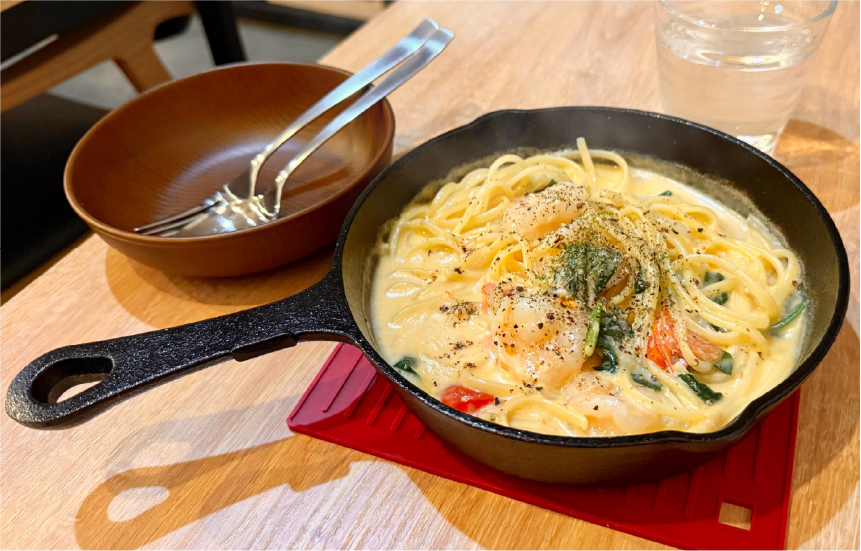 “最後まで熱々”が嬉しい鉄鍋パスタ「エビのクリームソース」。自家製ソースに、仕上げのエビ風味オイルが香りを重ね、ひと口目からふわっと海老の旨みが広がります。もちもち食感のパスタはソースとの相性抜群。大ぶりの海老はぷりぷりで食べごたえもしっかり。時間が経っても冷めにくいので、濃厚だけどクドくない、あたたかさとまろやかさをじっくり楽しめる女性に人気の一品です。